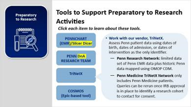 Penn Medicine Researchers who need to access EMR data, and data beyond what is contained in the EMR, in a prep for research capacity can use a tool called TriNetX. There are several different TriNetX Networks available but two we will focus on for research are the Penn Medicine Network and the Research Network.